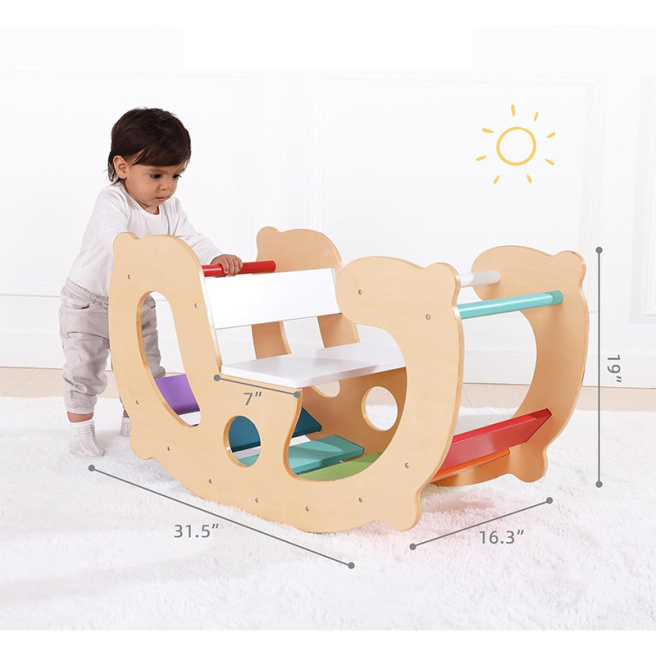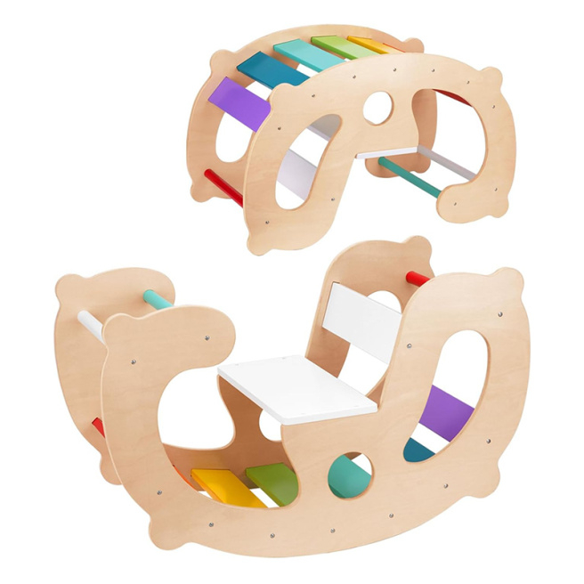Leagănul din lemn Montessori 2 în 1 oferă copiilor distracție nesfârșită! Acest obiect versatil le va oferi ore de amuzament și mișcare, sprijinind astfel dezvoltarea echilibrului, coordonării mișcărilor și creativității lor. Datorită designului la modă, care combină lemnul natural cu culorile curcubeului, se potrivește în orice interior și va deveni locul preferat pentru joacă și relaxare al copiilor dumneavoastră.
